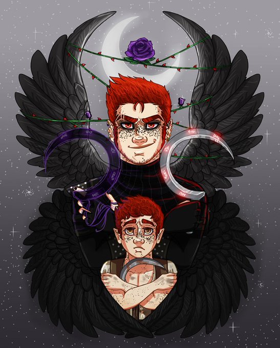 I'm a sucker for contrast between little and current Dekker 😉Black (griffon) wings (his mercenary group), purple roses (his knightly order), thorns (his 'guild'-in-progress), moons, stars, sickles… Just Dekker things. But the sickle is always constant! #DnD #CritterPCs