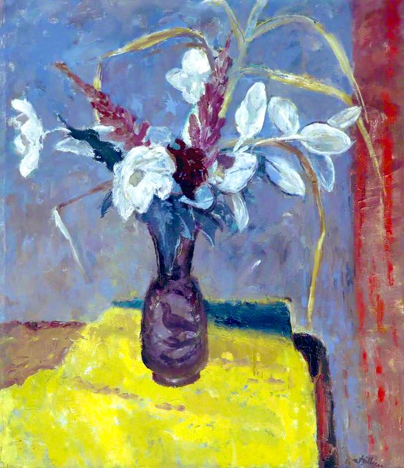 #cuadrodeldia Bodegón con jarrón de flores (William George Gillies 1898-1973), en Museo de Kirkcaldy de Kirkcaldy (Escocia) #art Este pintor escocés fue un notable paisajista y autor de bodegones, fascinado por el arte de Cézanne, Braque y Picasso #FelizJueves
