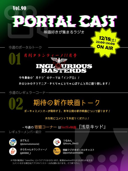 本日18日(土)のポータルキャストvol.90は、毎月恒例月刊タランティーノ!