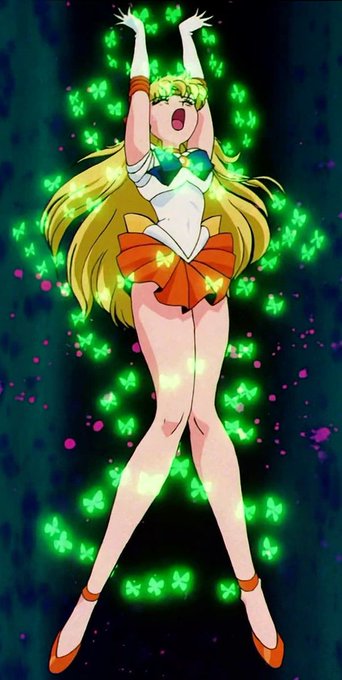 ヒロピンファンにとって神シーンとされる #セーラーヴィーナス のピンチ。必殺技が効かず、弱点を知り尽くされた敵に蝶で拘束(?)され苦しめられる♡