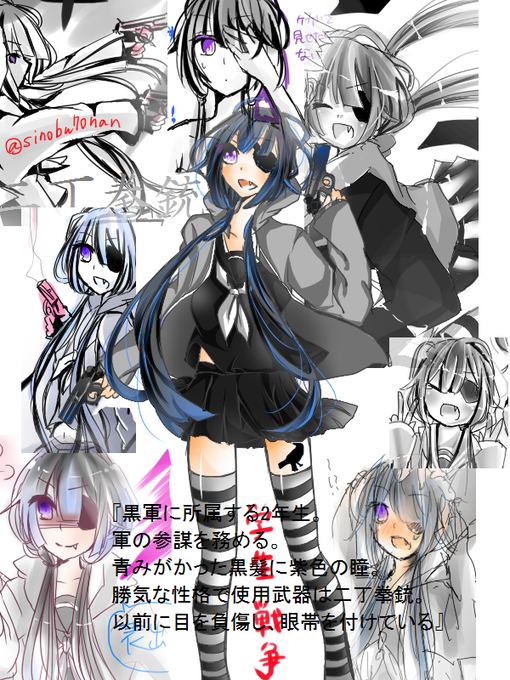 しの咲は『赤軍に所属する3年生。切り込み隊長。艶やかな黒髪に茶の瞳。自由気ままな性格で使用武器は長刀。実は裏切る機会をうかがっている。』 http://t.co/57J6T6wRcu