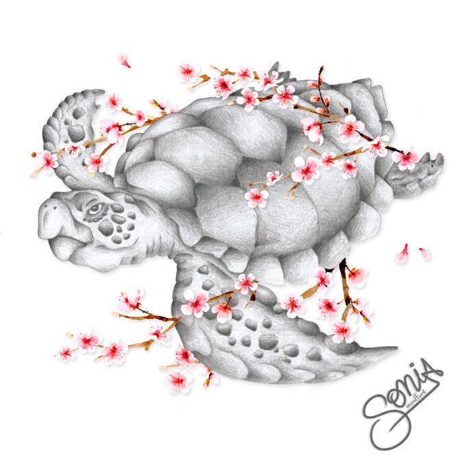 “Lo efímero y lo longevo”. La larga vida de la tortuga (técnica a lápiz) y la corta vida de la flor del almendro (técnica digital). Dos conceptos japoneses opuestos, unidos tanto en la ilustración como la técnica usada. 🐢🌸 #ilustracion #illustration #art #dibujo #drawing