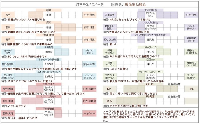 どどんとふ、ココフォリアを主に使っています~クトゥルフメインで他のもやってみたいなーと思いつつ…変な所でよく抜ける人ですが良かったら色んな人とやりたいです~!