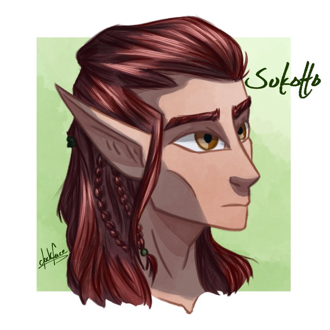 I have today Sukotto, wood elf druid/monk. (Gotta have that multi-class.) He is quiet, nature driven, and is quite often with his bird friend. Plus he has the best hair.