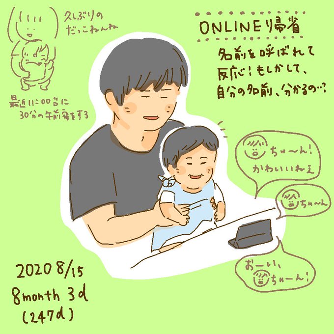 小さなスマホ画面から名前を呼ばれる度に「!」ってなっていて、もしかして、自分の名前がわかっているのではないか?ということがわかったオンライン帰省だった…会話はよそ見してるけど名前呼ばれると「!」って、すご、名前気に入ってくれるといいな(247d)