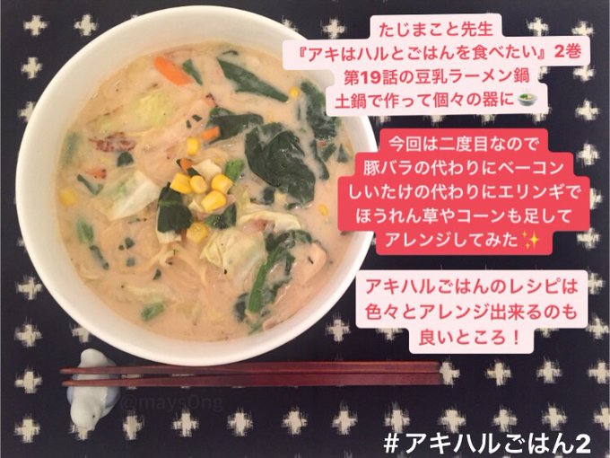 たじまこと先生『 #アキはハルとごはんを食べたい 』2巻19話の豆乳ラーメン鍋。麦いわく「豆乳みそってポタージュみたいにリッチだな!?」美味✨ボーイズライフな同居ごはんに興味を持たれた方はhontoが電子特典付きでBL全商品25%オフクーポン(~20日迄)があるのをお伝えしたく…! #アキハルごはん2
