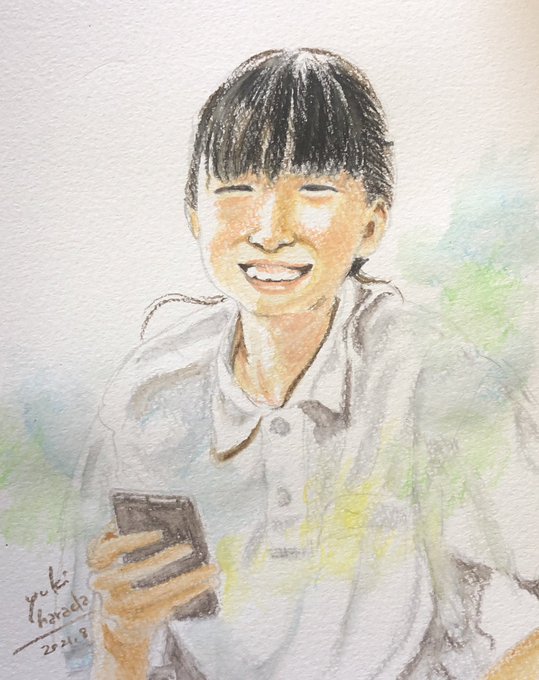 おとといの次女。前髪が今日は上手くまとまった、と嬉しそうなその顔を描きました。笑顔がステキな我が家のニコリちゃんです。見た人みんな、happyになれ!🌸