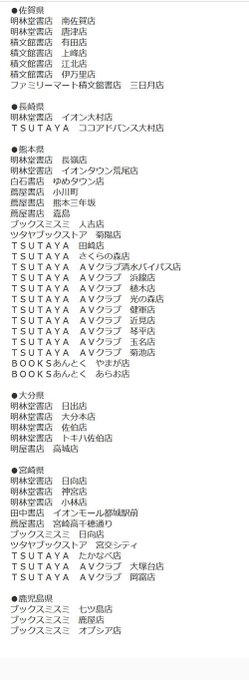【拡散希望です】そして付録イラストカードの実施書店さん一覧です。九州が沢山でその他全国各地にあります。お近くの方はこちらの方もどうぞよろしゅう🐎