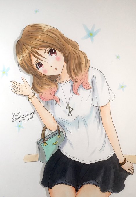 この絵では第二楽章で登場したコーデを参考にしました。もっとひらひらした感じかと思いきや、シンプルな白Tシャツに黒のショートパンツ (ショートキュロットにしちゃったけど)