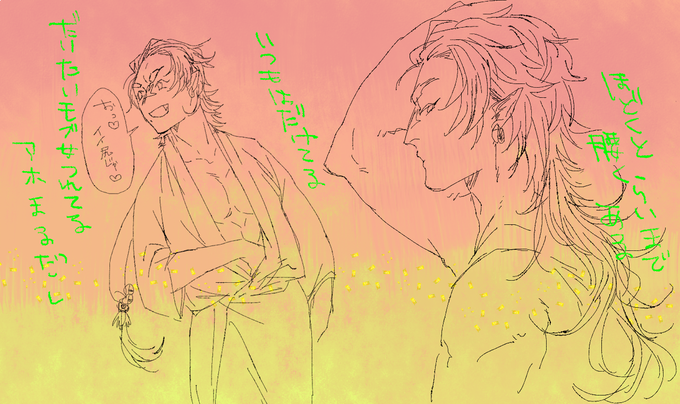 ジュリアちゃんとおんなじ頭身で描きたかったけどうまく描けなくてキャラシ投げ出してるテオラメールっ子の鬼いさん。こんな、こんな感じがいい……左の角は折れてて、普通の人間より腕長めな赤鬼さん。反転目は兄貴の性癖です