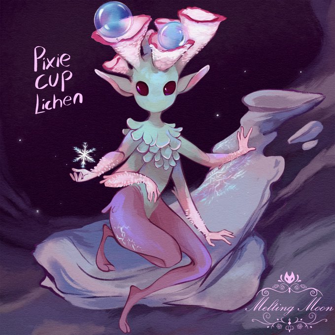 #funguary day 2 Pixie cup lichen // This pixie cup lichen lives near the top of the mountain near the town, where it gets frigid in the winter and stays cold in the nights. She can manipulate the water and ice around her.