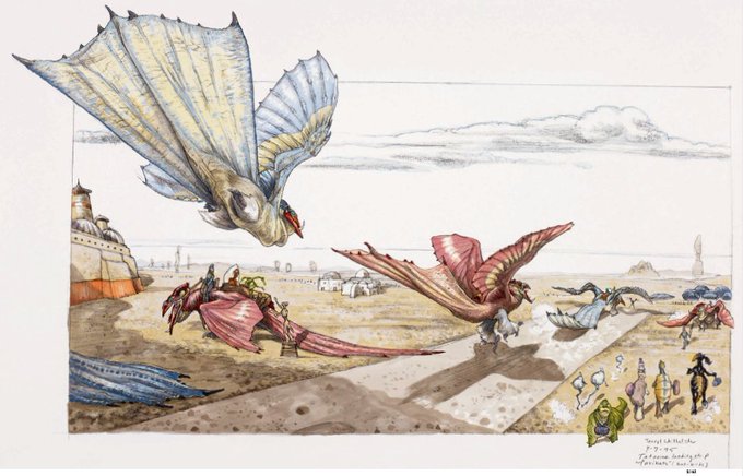 July 7, 1995: Star Wars: The Phantom Menace: Terryl Whitlatch imagined a landing platform for “avibats (bat birds)” on Tatooine. Whitlatch: “The animals on Tatooine, the ones the Gungans ride, or that live in the swamp, need to have lives of their own to be believable.”