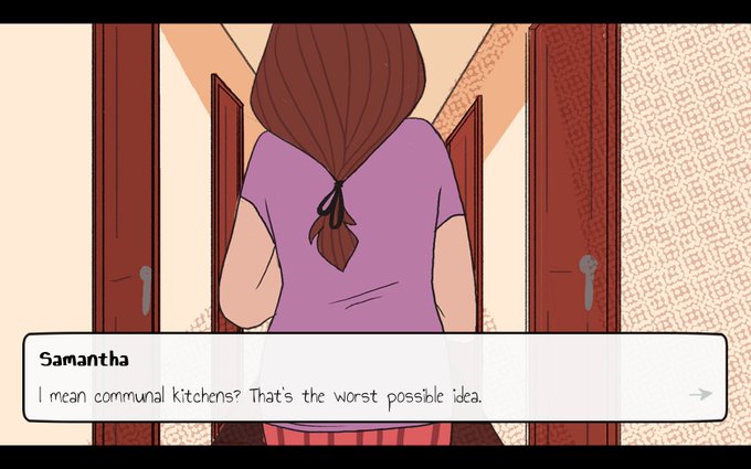 対人恐怖症だが空腹のため共用キッチンにオートミールを作りに行くサマンサを、適切な選択肢でフォローし無事に部屋へと帰還させるゲーム、The Average Everyday Adventures of Samantha Browne