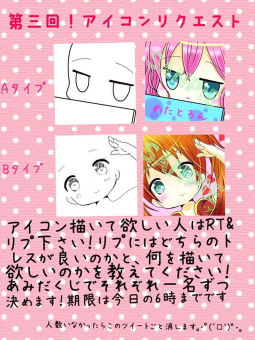 #アイコン描いてほしい人RT #私にアイコン描いて欲しい人RT #私の絵嫌いじゃないよって人RT 楽しかったらまたやります 【定員は2名様まで、多数のRTがきたら抽選にします】 期間は明日の昼までにします、下はサンプル