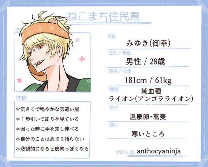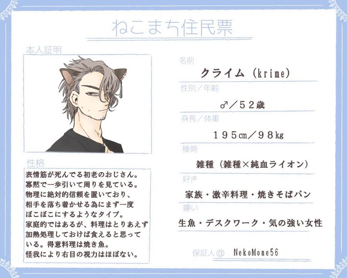 こちらの企画(@nekotatinomati)に7人目失礼します!初老のおじさんです。事前で養父・勤め先関係いただいておりますが、その他は空いておりますのでよろしくお願いします!