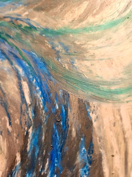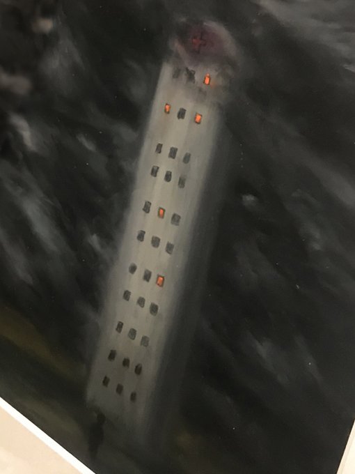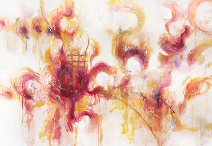 下地を作った板にオイルパステルで描き、色鉛筆でアクセントを加えた作品。幻想的なフィルターをかけたような仕上がり。作品と対峙する距離感で受ける印象の変化も楽しめる。太宰治をテーマにした不穏な暗闇に伸びる建物作品が印象的 https://t.co/Zbx0e24Vx8