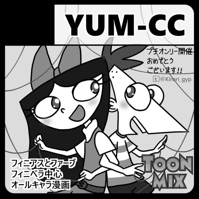 9/10グッコミ内開催の #TOONMIX フィニアスとファーブで参加します!たてごと @tategoto3 酢蛸ちゃん @sudako_ のサークル「ぼくらのアヴィみ」と合体です🙌たてちゃんと共催してる11人名による合同誌が!出る予定です!!個人誌でフィニベラ出せたらいいな