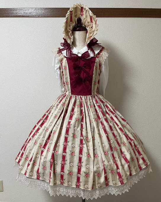 宣伝です♪クラシカル系が好きな方にオススメのジャンパースカートとハーフボンネットのセットです。アンダースカートはワインレッドで後ろバッスルにしてメリハリを✨🥀