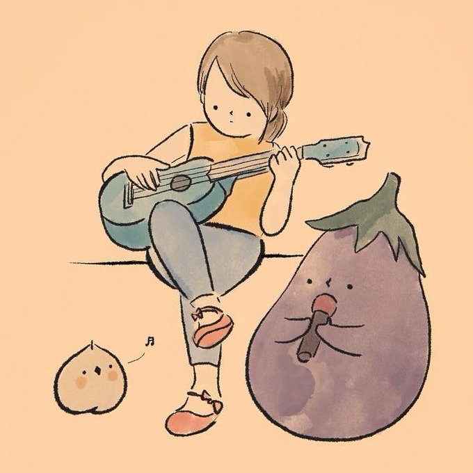 One day in 2019, out of nowhere the name 'Little Joy' came up in my head, with a vision of a chubbier aubergine than I used to draw, so I drew a quick one and gave her the name. And I also gave her a hype girl, inspired by a chickpea, with the simplest name, Chick P.