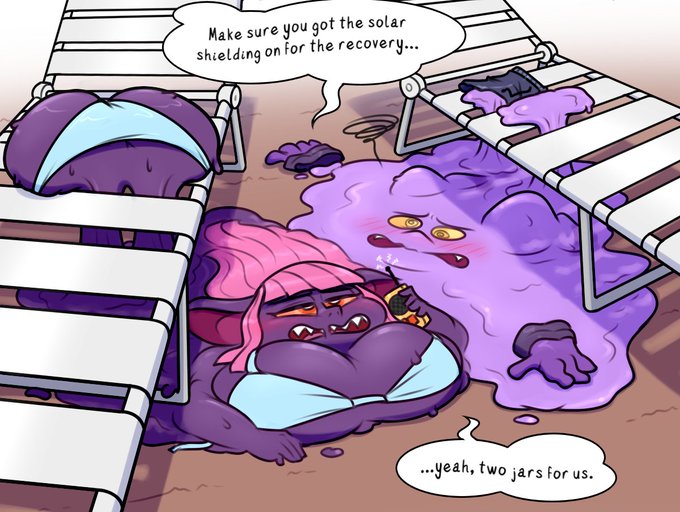A patreon commission for Lore, featuring his goblin OC Dr. B and her henchman sunbathing on a especially hot planet. A little too hot perhaps, as they can't seem to help from becoming goop in the sun.