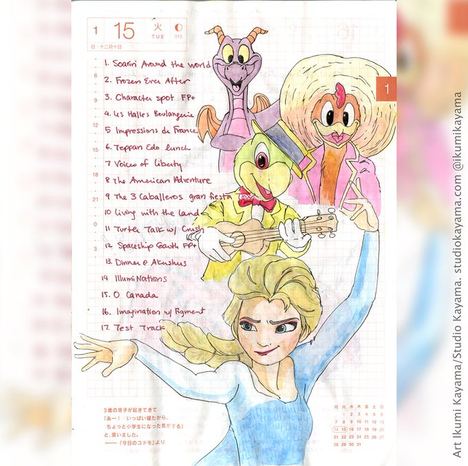 Beautiful day in #Epcot. Here are some Disney friends you can see on various rides in the park. Are you against having characters in Epcot? We missed the 35th anniversary of the park. #hobonichi #disneyworld #frozen #figment #threecaballeros