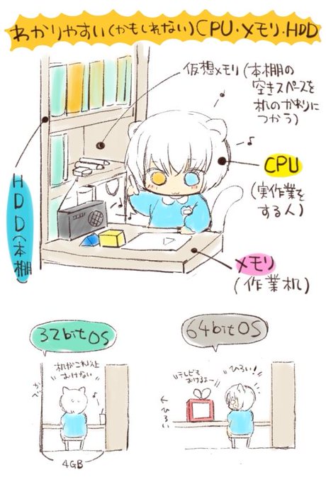 メモリ・CPU・HDDの関係と32bitOS・64bitOSのメモリのわかりやすいかもしれない絵(PCはしろうとなのでまちがっていたらすいません…)