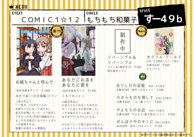 明後日のCOMIC1☆12のお品書きを再掲です。