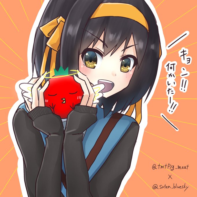 とまとりにくさん(@tmtPig_meat)を描くのが流行っているようなので、不思議な生き物を見つけるハルヒを描きました。