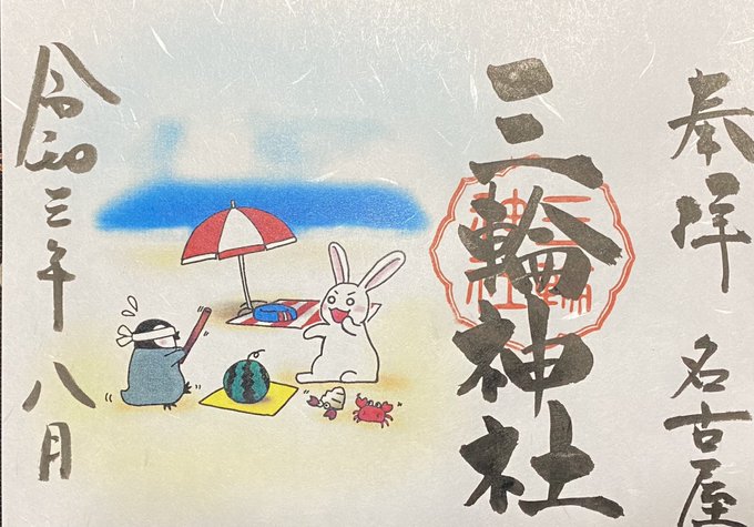 名古屋市 三輪神社さん⛩ 花火🎇 スイカ🍉 夏休み⛱ 七福神お守り🧧 書置き御朱印頂きました☺️
