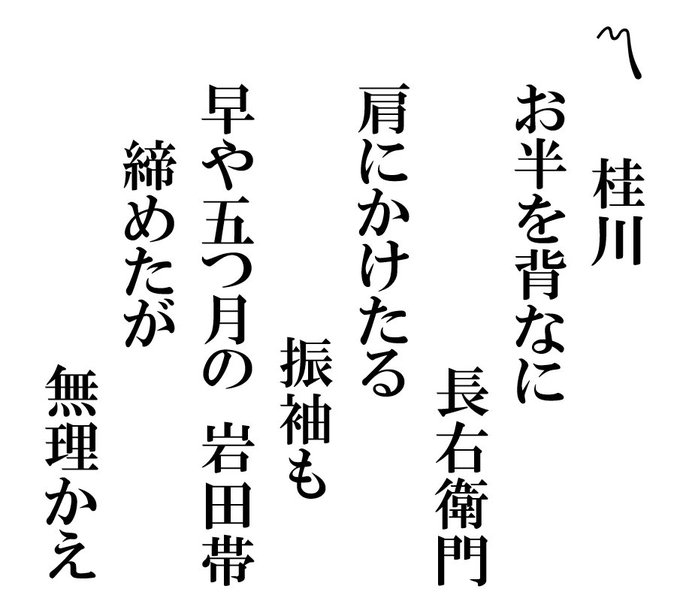 今月歌舞伎座で上演中の「桂川連理柵」でのお半(14歳)と長右衛門(38歳)の心中を唄った小唄です。「無理かえ~」の後へ戻れぬ絶望感、心中へと向かう三味線の後弾き(オクリ)の切ない響きが聞かせ処です(1分45秒)