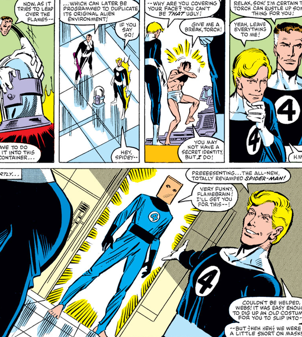ちなみにスパイダーマンが初めてマスク代わりに紙袋をかぶった時は、シンビオートのせいで服がなかった時ですね。