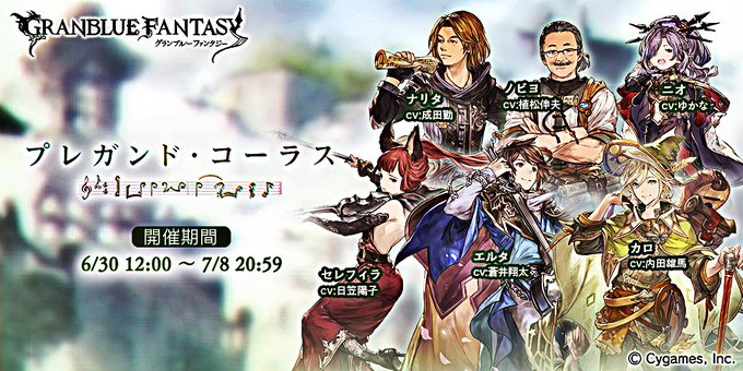 おおう!遂に明日のお昼の12時からイベント「プレガンド・コーラス」が開催のお知らせがアップされてテンション上がってきました♪何と、ノビヨ師匠とナリタ氏はオケキャラのフェイトエピソード以来のご登場で豪華ですね♪音楽イベントは久しぶりなので耳福な気分で堪能したい♪ #グラブル