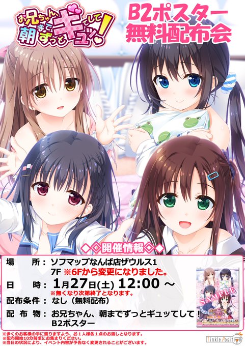 このあと12時から大阪のソフマップなんば店ザウルス1さんで新作「お兄ちゃん、朝までずっとギュッてして!」のポスターの無料配布なんだよ~よろしくおねがいします。