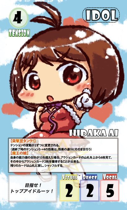 能力は平均少し低め、ですが、テンションが低下した際にも再び上げやすく、何よりレッスンを続けると、アクションカードを選んで2枚もらえるという強力なスキルを所持しています!