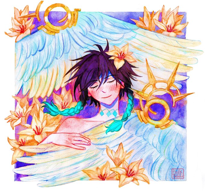 Ситуация такая: хотела нарисовать Венти нэжненько в пастельных цветах и тонах, нарисовала, но мой угашенный об дерево сканер плевать хотел на такие художественные тонкости, поэтому я решила не мелочиться и выкрутить яркость максимально🤷♀️
