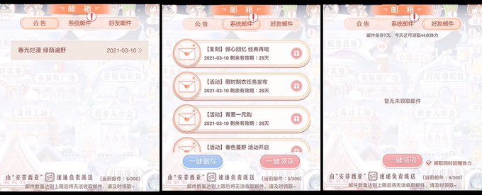 列が【お知らせ/システムメール/フレンドメール】の3列になり、一括受取&削除可能に