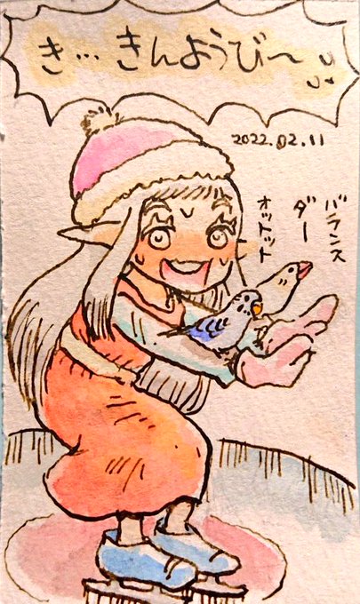 はっがさん( @tm7_hagga )の 「きんようびーー」をやってみたくて、9/10の、こめちゃんのポーズをいただきクッキーちゃんでやってみました😊はっがさんのタビラコちゃんは友情出演(模写)🌻タビラコちゃんさかさか描けて楽しい&PC水彩初挑戦。初パース付き絵で一週間苦労しました💦 #ライジンオー