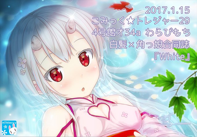 来年1/15 こみトレ29 4号館オ34a わらびもち で頒布される nadekoさん( @nadeko_shiro )主催の白髪×角っ娘合同誌『White』に参加しています。