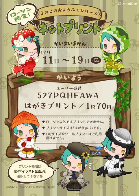 【🐬きのこのおようふくシリーズ🍄】 遅くなりましたがネップリ登録しました!対象コンビニはローソンのみとなります。 プリント可能期間:12月11日(月)~19日(火)PM12時頃まで いくつか注意事項がございます。詳細は画像をご確認下さい🍄