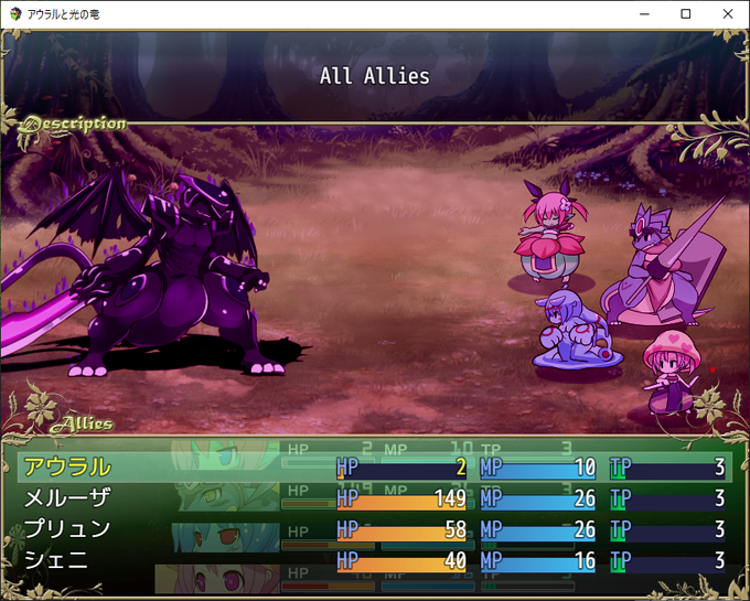現在はサイドビュー戦闘王道シナリオなRPG「アウラルと光の竜」(前日譚)を制作中です。イラストやサイドビュー素材は自作です。