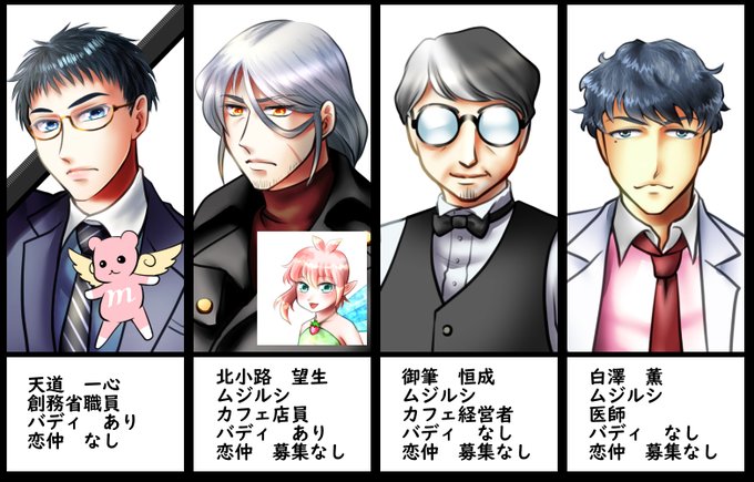 キャラ増えたのでまとめてみました。「こんな関係組んでやってもいいかもしれないと思ったけど自分から言うのめんどくせーな」といった方は、いいね押して頂ければ伺います。もちろん直接リプくださってもOKです。