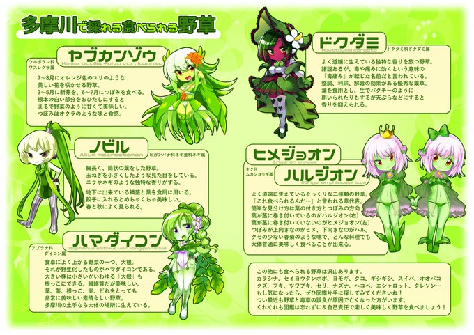 コミティア124で無料配布したペーパーです!食べたことある野草を擬人化して簡単に説明をつけてみました。tよんでみてね~ #食べられる野草擬人化