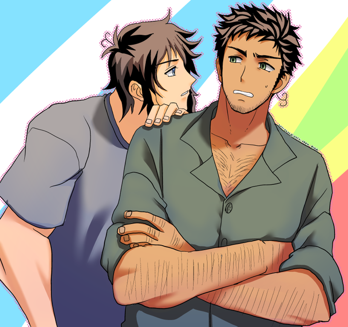 はっはーさんからおたおめイラスト頂いたので自慢させてくださいー!(掲載許可いただきました!)サディクさんとロマニが仲良さそうに会話してて心がほにゃほにゃしますー!絶対甘いものについて語ってる…w