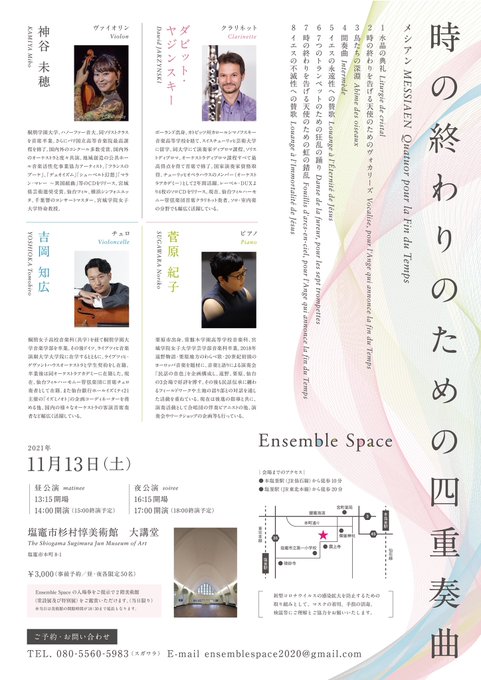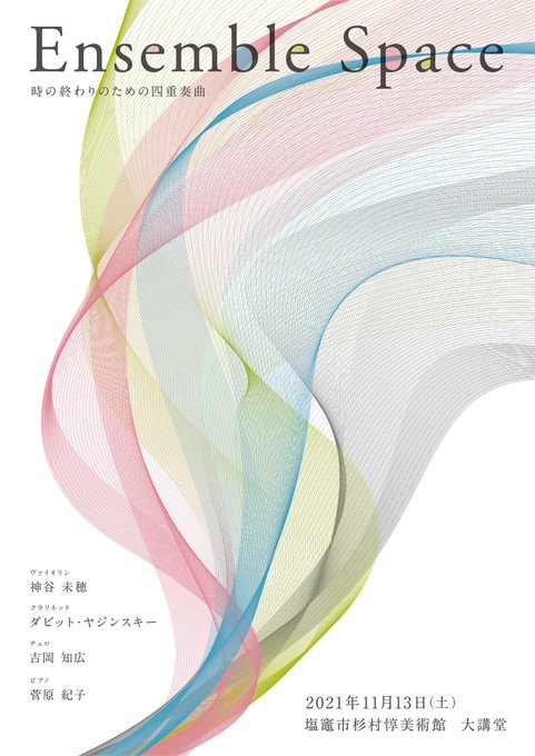 栗原在住のピアニスト菅原紀子さんが主催する演奏会『Ensemble Space』のチラシデザインを今回も担当しました。メシアンという作曲家が第二次大戦中に捕虜生活の中で書き上げたという「時の終わりのための四重奏曲」がテーマとなっており、自由の象徴である翼をイメージしたビジュアルにしました。