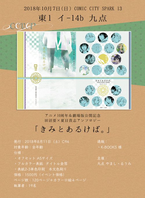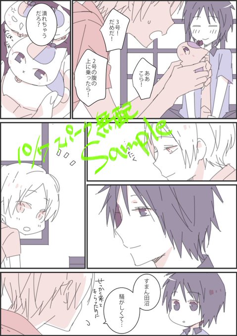 10/7 スパークはるうみ @Q10_ruumi と田夏spで参加します~!無配予定の田夏ペーパーサンプルとお品書きです。わたしの方はネタバレ無しの田夏+トリプルニャンコ漫画です(無配は後日ツイッターでアップします)夏コミで出しました主催の田夏アンソロも持ち込みますのでよろしくお願いいたします!