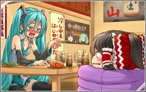 きつねさんの「居酒屋でミク霊夢」の絵は、hiyokoさんのトークロイド動画「ゆっくりとミク」シリーズの支援絵となってます。絵の元ネタが気になる方は、ぜひ、動画のほうもご視聴ください。