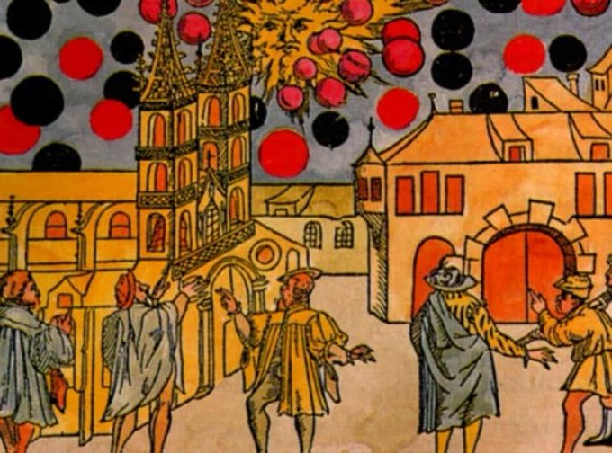 「foomii/有料メルマガ」『ASKAサイバニック研究所』「●中世ヨーロッパ上空で起きたUFO乱舞事件は本当?」1561年4月14日ドイツのニュルンベルクに轟音と共に幾つもの発光体が出現し巨大円筒形や十字架まで現れ太陽の周りを飛び交い争い墜落する現象に市民は騒然となった!!