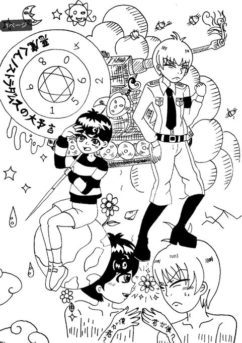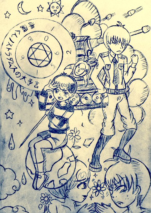 🌟扉絵ラフの使わなかったやつを…! 帯風のは『ノストラダムスの大予言、やっと仕事をする』と描いてあります☺🌠笑