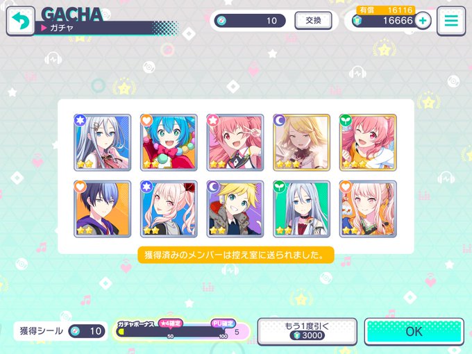 水辺ガチャ10連 ミクさん要素はワンダショミクさんでしたw😄 バナーの愛莉さんも⭐️3キてますねw😋
