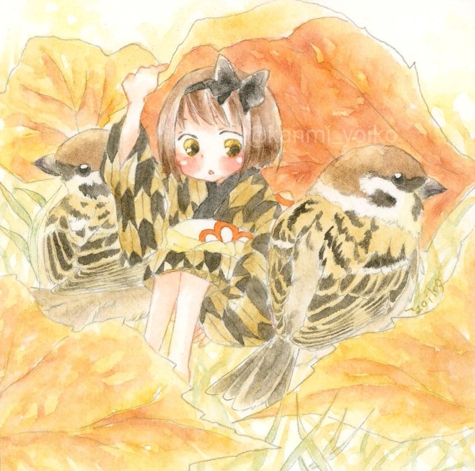 たくさんの鳥愛を込めて、小鳥と人のほのぼの仲良しライフを水彩、顔彩で描いています。